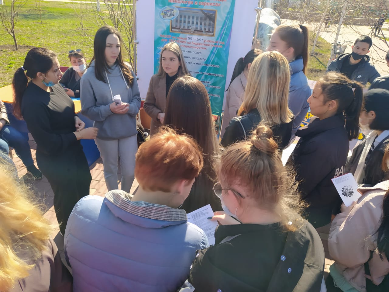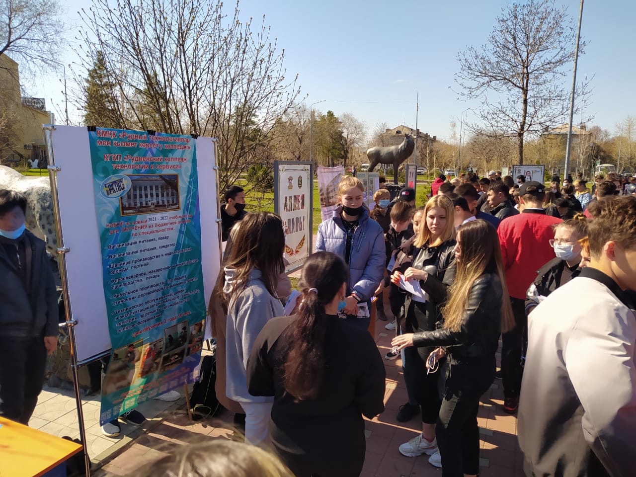 29 апреля 2021 года в парке «Достык», что находится по улице Мира ½, проводилась городская ярмарка вакансий для выпускников учебных заведений, безработных граждан и лиц с ограниченными возможностями. КГКП «Рудненский колледж технологии и сервиса» принял участие в городской ярмарке для информирования выпускников средних школ и безработных граждан о возможности прохождения профессионального обучения. С целью широкого информирования о востребованности специалистов на рынке труда города и области была обеспечена явка выпускных курсов колледжа и слушателей курсов по«Государственной программе развития продуктивной занятости и массового предпринимательства на 2017-2021 годы» «Еңбек». |